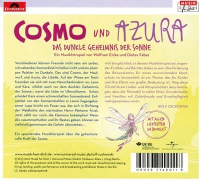 Das zauberhafte Musik-Hörspiel für Kinder ab vier Jahren – gefördert von Rolf Zuckowski und der Deutschen Gesetzlichen Unfallversicherung!Die Sonne spendet Wärme, Licht und Leben, die hat aber auch negative Seiten. Mit der Beratung von Rolf Zuckowski hat das Institut für Arbeitsschutz der DGUV als Präventionsmaßnahme dieses Musik-Hörspiel produzieren lassen. Die Lieder-Geschichte vom Maulwurf Cosmo und der Libelle Azura soll dazu beitragen, dass schon für die Jüngsten ein sonnensicheres Verhalten selbstverständlich wird.